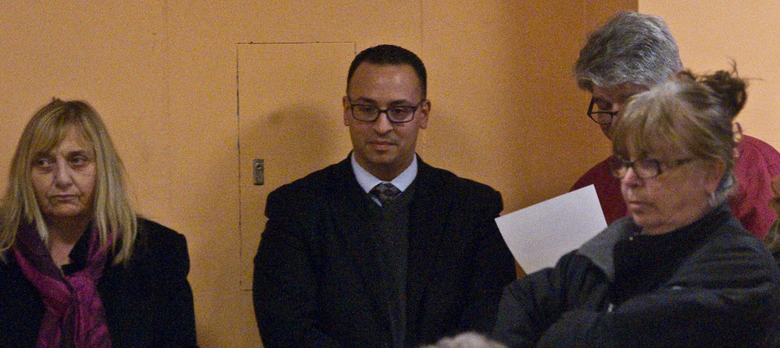 At this point, the front of the room where the heavy concentration of Garcia supporters with anti-Stuiver t-shirts start complaining against the recess as Lt. Campbell walks onto the scene.