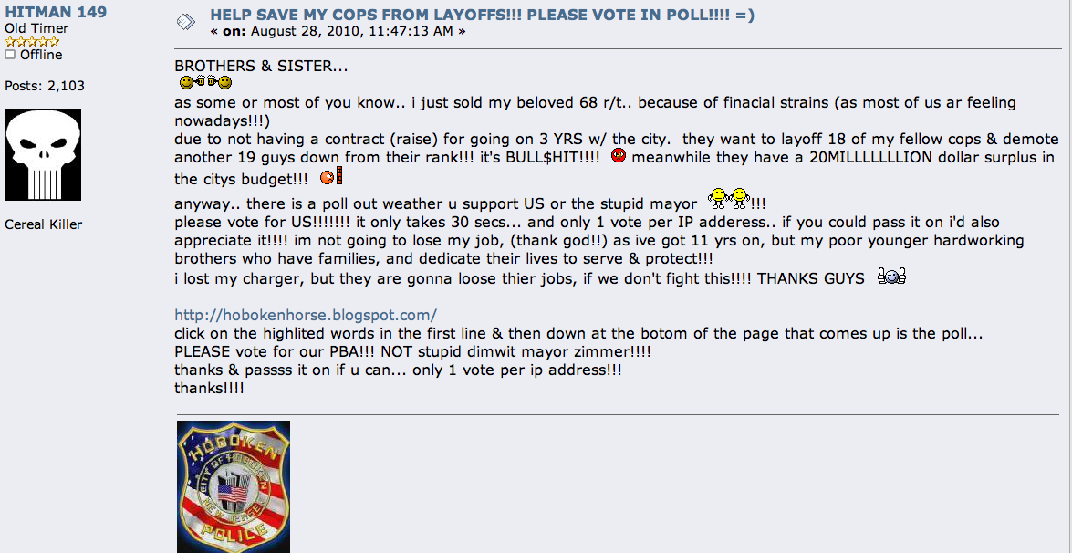On the Hoboken Journal poll featured here on MSV, repeated voting is prevented but that doesn’t mean you have to be in Hoboken to vote. In fact one local officer, who calls himself Hitman 149 reached out to a some friends on a website and asked folks to vote in the poll here on MSV. Nothing wrong with it really, it shows he really does care about his fellow officers: