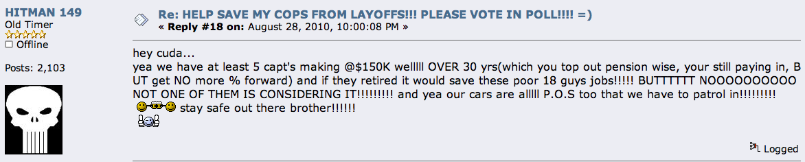 Later in the thread, the Hoboken officer describes his frustration with senior officers who won’t retire and save the jobs of the younger officers. He concludes there are five captains in the Hoboken Police Department who could but none will. (MSV has heard one possibly will but won’t name the individual, as that’s a privacy issue.) Here’s how HITMAN 149 tells it: