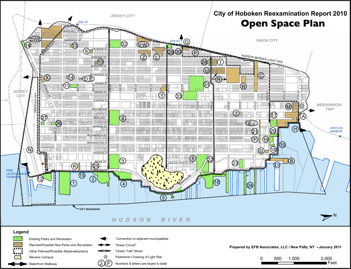 | A City of Hoboken 2010 map identified areas for reexamination in a Mayor Zimmer Administration Open Space Plan. The serious intent of acquiring open space for Hoboken’s 52,000 residents enters a critical phase under the mayor in the two year effort surrounding the BASF Henkel Cognis site at 11th and Madison in west Hoboken. |