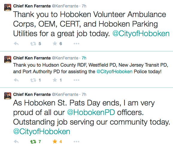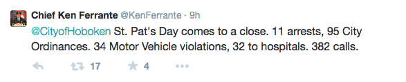 Hoboken Police Chief Ken Ferrante shot out twitter posts communicating the unofficial data end of day demonstrating continuous improvement year over year: