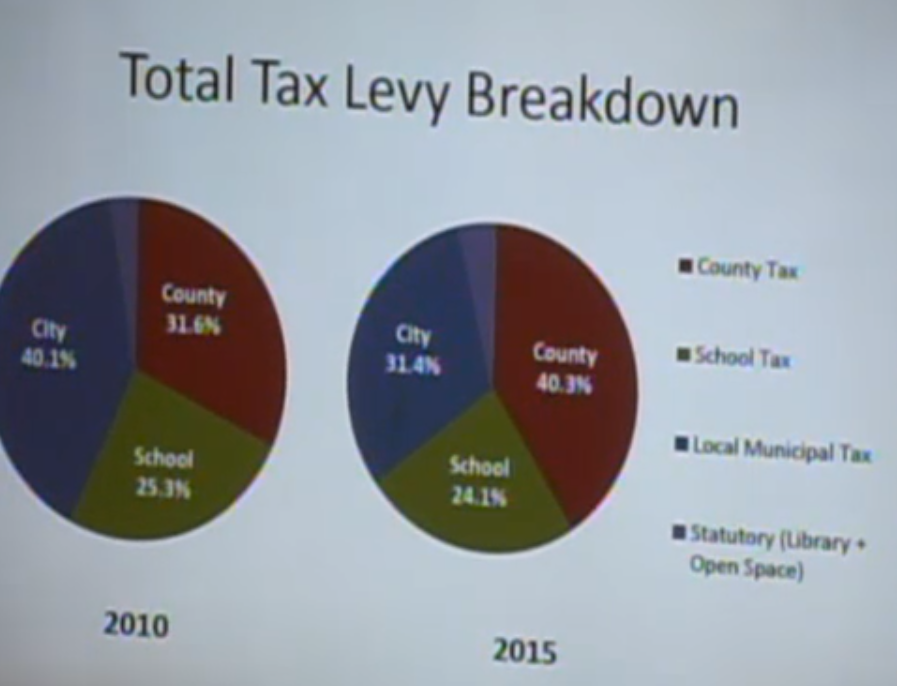 This chart presented by the Hoboken Finance Director shows the tax levy for the County (HudCo), BoE and the Municipal Tax (under the mayor) from 2010 to 2015 on a percentage basis. |