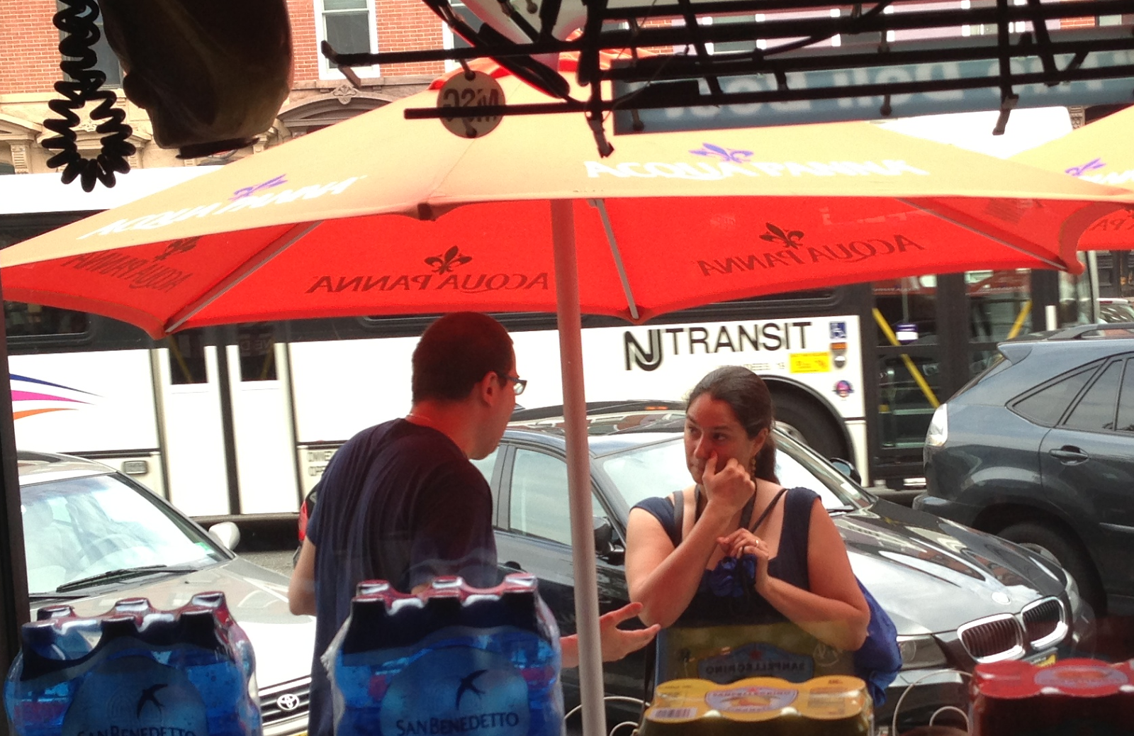 | BoE trustee Peter Biancamano an unannounced council candidate speaks to a Hoboken resident Saturday as a final petition push was underway. |