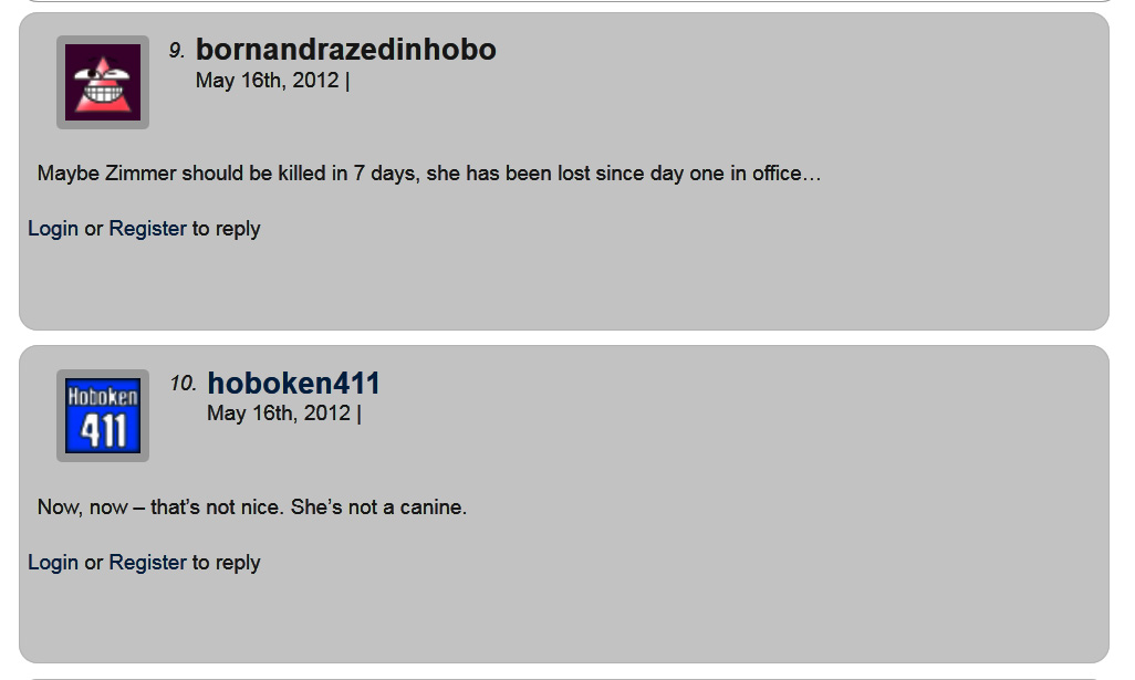 Upon hearing this, there was no comment from Vermont Klaussen at Hoboken411 who is renown for his hatred and vitriol toward the mayor for her council majority refusing to put him on the taxpayer dole with payments from the City back in July of 2009. He however chimed in at some point that day making light of the utterance the mayor “should be killed.”