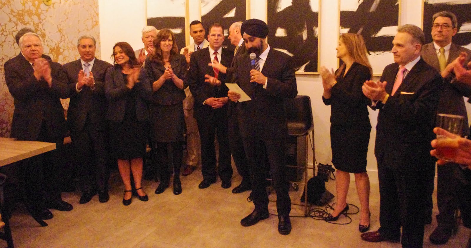 | Councilman Ravi Bhalla acts as emcee to the big bash at Porter Collins last night. Missing from this photo among the political signatories is State Senator Sandra Cunningham who arrived late for this photo but stood near the new Hudson County Freeholder Chairman Anthony Vainieri and Weehawken Mayor Richard Turner (l). To the rear of Councilman Bhalla is Phil Murphy and State Senator Brian Stack. |