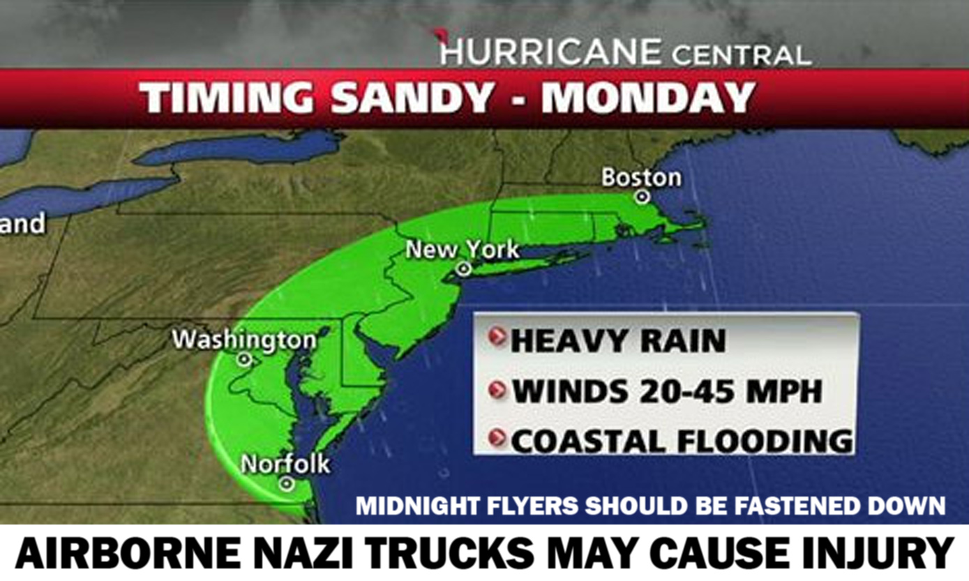 | This is an emergency communication of the Bet Mazin Nazi swastika truck team. Had this been our actual Nazi truck flying in the air during a hurricane, you would be given notice of where it’s flying and how to avoid being hit with either the vehicle or one of my lawsuits. Disclaimer: N/A to any of you Zimmerists or worshippers of the guy due north above our heads. I’ll sue you all? |