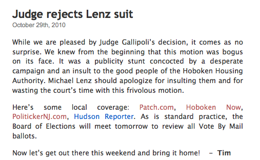 The Lenz for Council campaign is pressing its case for about 200 suspect ballots with numerous problems ranging from voters not being residents of Hoboken or the 4th ward, people who are not listed on a lease in the HHA and the always important bring out ye dead vote. All of these problems have been tediously researched and brought to the attention of the Board of Elections. The reaction was non-pulsed but a little oversight from the State Attorney General’s office could go a long way.