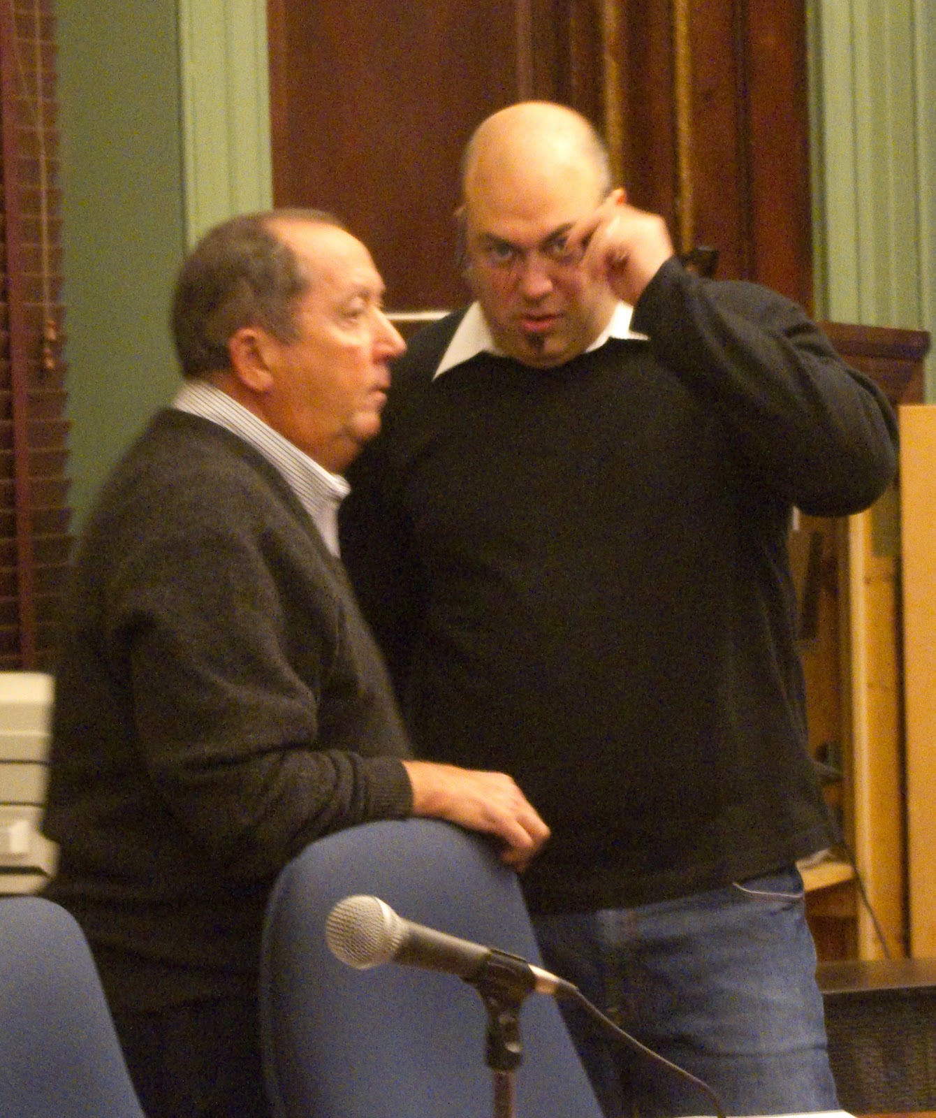 | Councilman Mike Russo with City Clerk Jimmy Farina before the special meeting Sunday. |