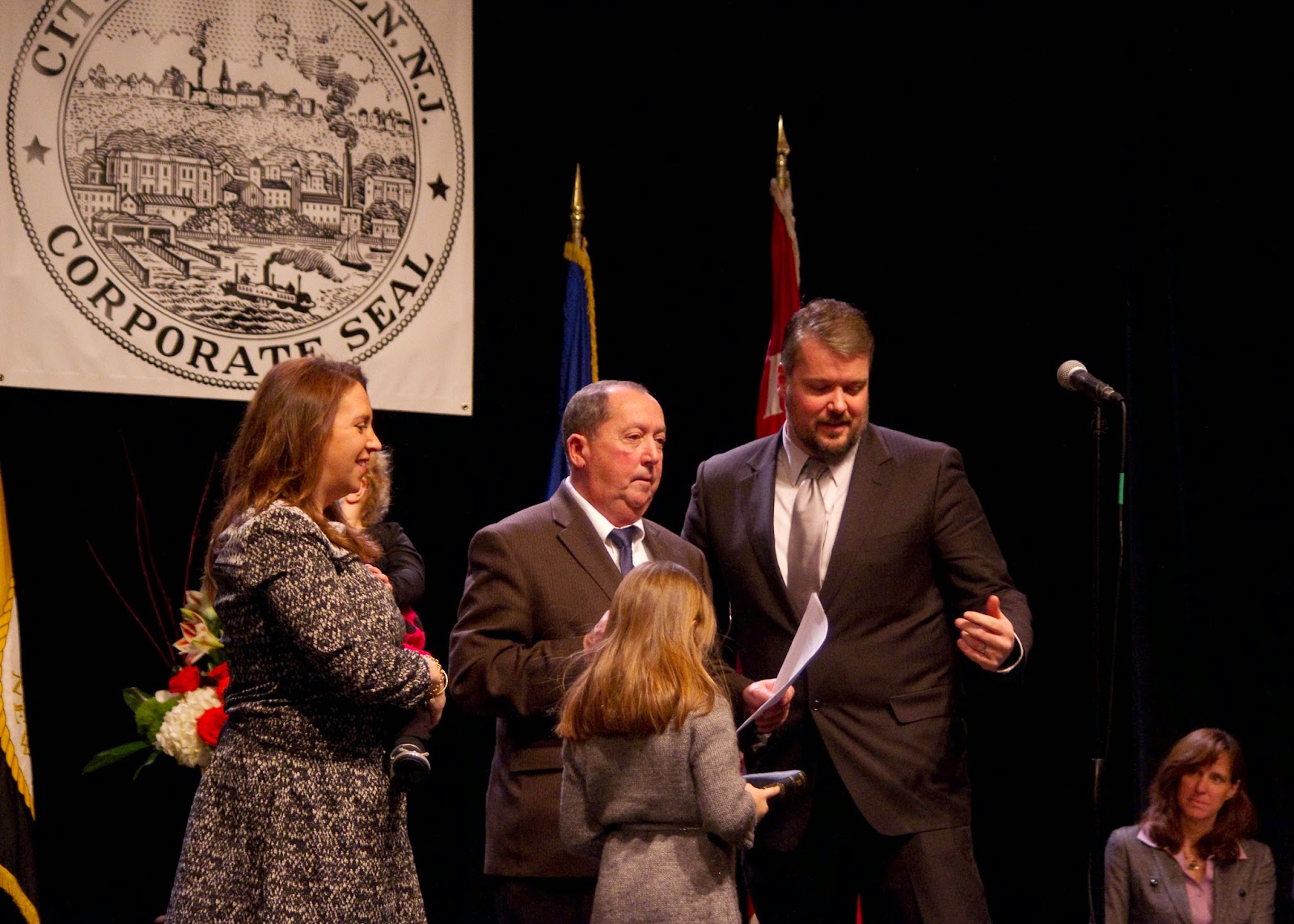 | Councilman Dave Mello seen here in early 2014 being sworn-in by City Clerk Jimmy Farina with his family and Mayor Dawn Zimmer looking on offered the Hudson Reporter his phone number last night. He did so right during the City Council meeting after frustration seeing incorrect, completely false actions attributed to him. |