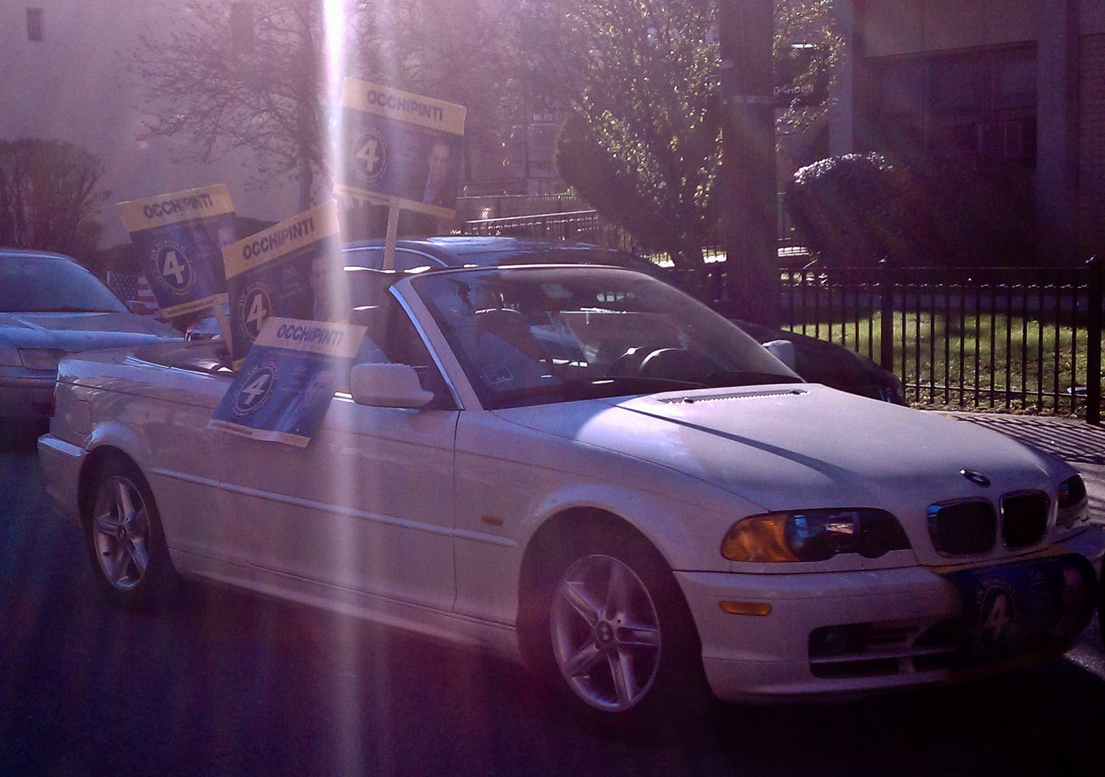 Put this one in the it could have been worse file but it’s notable for the continuing pattern emerging over this last day and in this fourth ward campaign overall. A young mother supportive of the Lenz campaign was on her way to vote and came across a vehicle with signs all over it spouting Occhipinti every which way. The car was parked well within the 100 feet of a polling station, an activity in and of itself considered electioneering and therefore illegal.