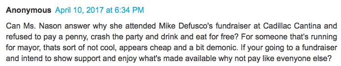 There certainly was a good crowd of people at Cadillac Cantina for Councilman Mike DeFusco’s fundraiser. Mayoral candidate Karen Nason was certainly in attendance. So was a Horse.