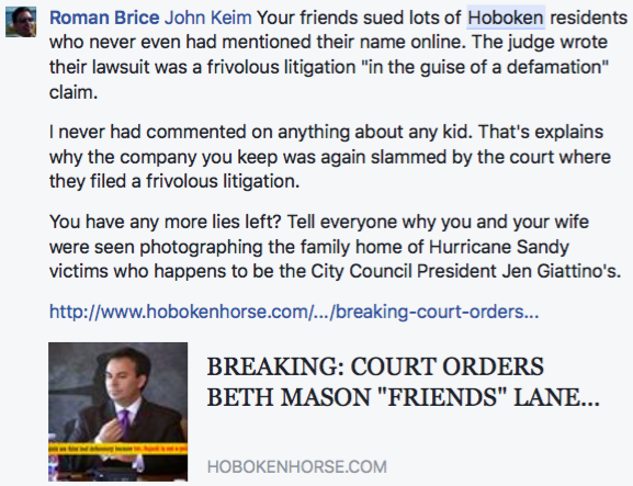 | John Keim and Ines Garcia Keim get a response to their Facebook lies and about their friends, Lane Bajardi and Kimberly Cardinal Bajardi publicly backed by former councilwoman Beth Mason in the SLAPP-suit against Hoboken residents. |