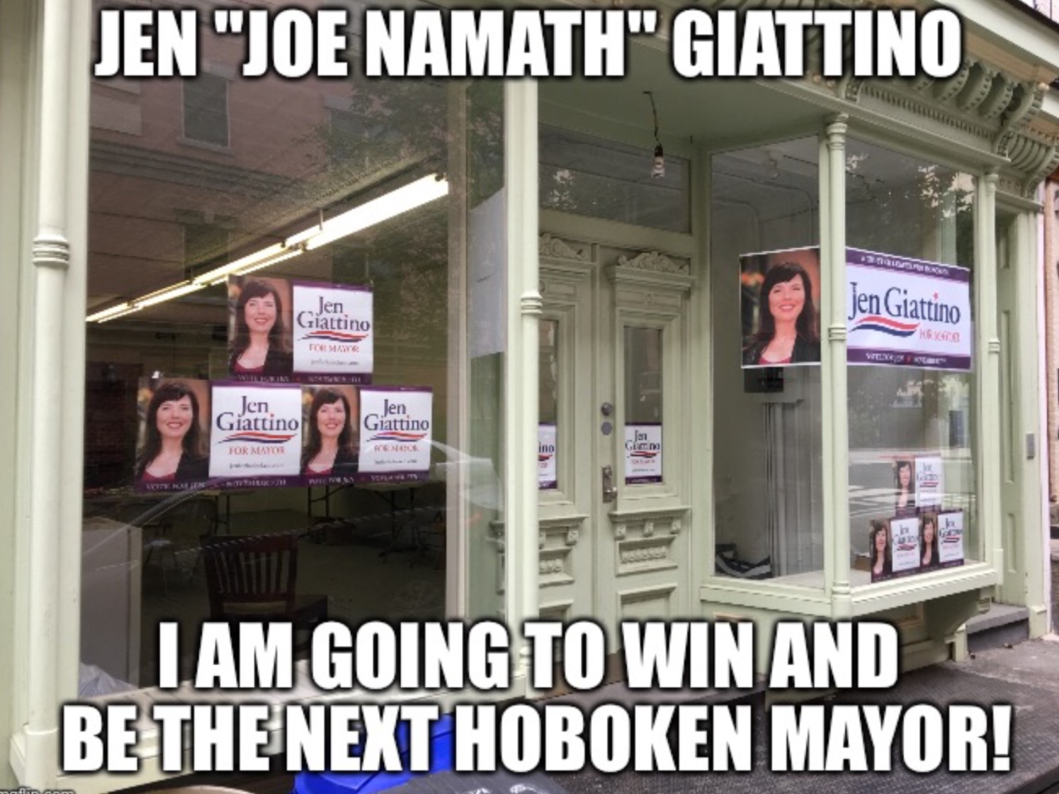 City Council President Jen Giattino’s new campaign office at 152 Newark Street as pictured here courtesy of Kurt Gardiner who also supplied the Joe Namath meme. |