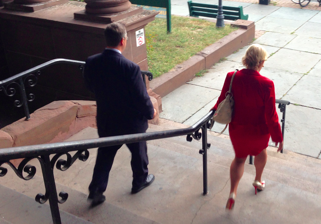 | Steve Kleinman leaves Hoboken Municipal Court with his client former Councilwoman Beth Mason in September 2014 after phony criminal charges were filed against this editor later thrown out of court. |