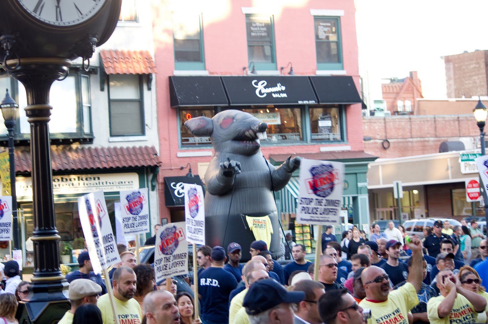 | The Rat, nicknamed Scabby appeared in Hoboken last September at the police union protest. It’s spent the day today in Trenton with equally unimpressive results. Hoboken’s protest changed nothing and led to no layoffs and a police reorg saving the town several million dollars in costs including health care. |