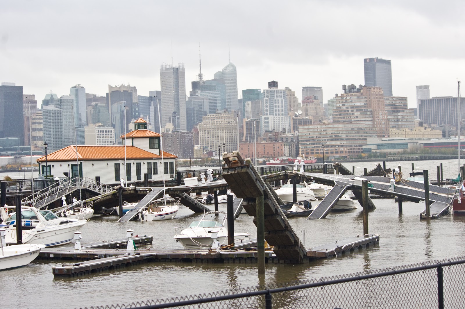| The uptown pier took a big hit. It’s symbolic of the hurt Hurricane Sandy put on Hoboken and NJ. Waters are receding but areas typically flooded have even more water to contend with and will need time. It’s not clear how effective the NHSA Pump is doing but it should be helping bail the flooding out. |