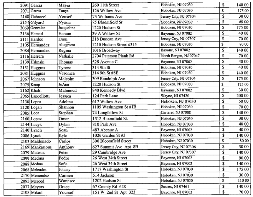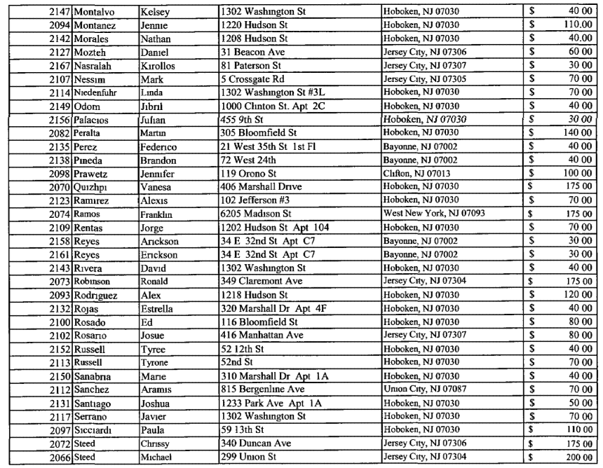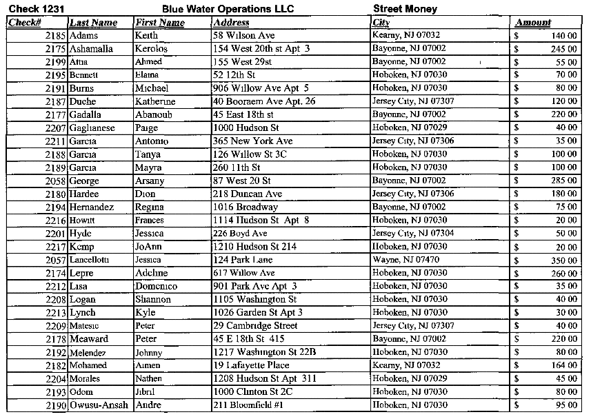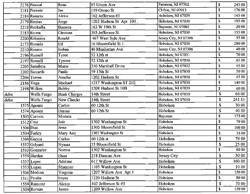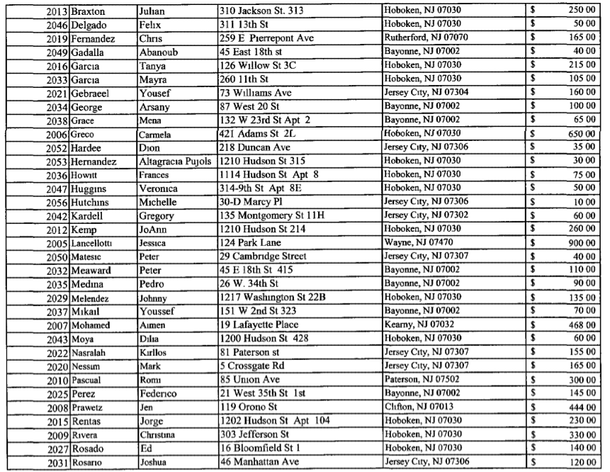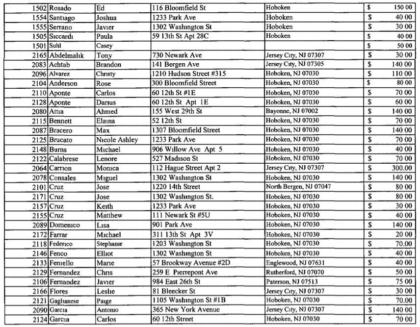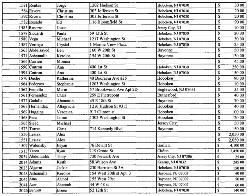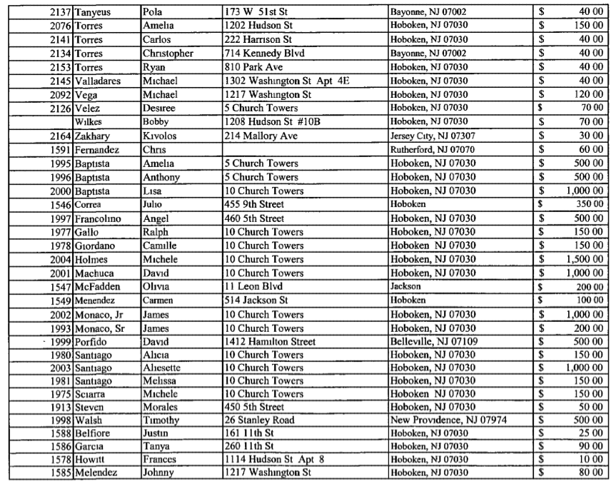 The numbers of people from all over Hoboken and outside is impressive with just one example being a Justin Belfiore of 11th street for $25.00. Did they all work on election day in the 2nd ward? Or did they also carry a presence in the 5th ward for Scott Delea?