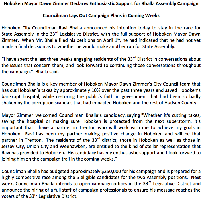 News Mayor Dawn Zimmer enthusiastically endorses Councilman Ravi Bhalla for State Assembly 04/24/201301/22/2021 by SmartyJones The Bhalla for Assembly campaign announces: Post navigation Tim Occhipinti’s pandora box backfires as Beth Mason explodes over information discussed with MSVHoboken the home of baseball and a very fine Mighty Petz win