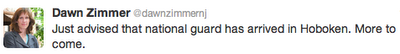 News Mayor Zimmer announces: National Guard in Hoboken 10/31/201201/22/2021 by SmartyJones October 30th Hoboken 11:25 pm Mayor Dawn Zimmer requested the National Guard yesterday and via twitter the announcement is in; they have arrived: Post navigation National Guard arriving to aid evacuations, deliver supplies, pumping out, powerMayor plea for National Guard answered, now the hard work begins