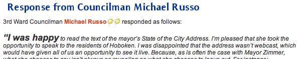 Mason411 carried her ally Mike Russo’s “response,’ immediately the next day which began with a lie so obvious it was deleted before being resent to Hoboken Patch.