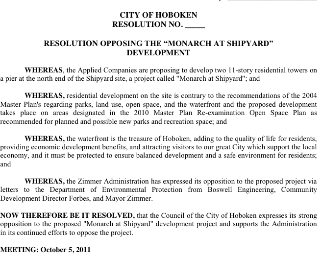 | This is the resolution put forward by the Mayor’s Administration on the Monarch Development. A letter was featured in the Hudson Reporter by a resident complaining Councilwoman Beth Mason ignored their concerns on it and did not even acknowledge their constituent outreach. |