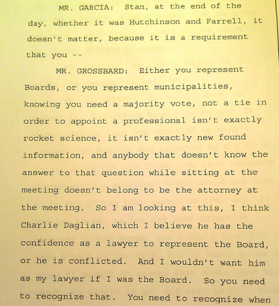 In one portion, Garcia attempts to smooth over why the failed resolution for the auditor needs more review but is “schooled” by Grossbard who explains what the failure means to both the resolution and HHA counsel Charles Daglian and how his action would lose confidence to keep him on as the HHA attorney.