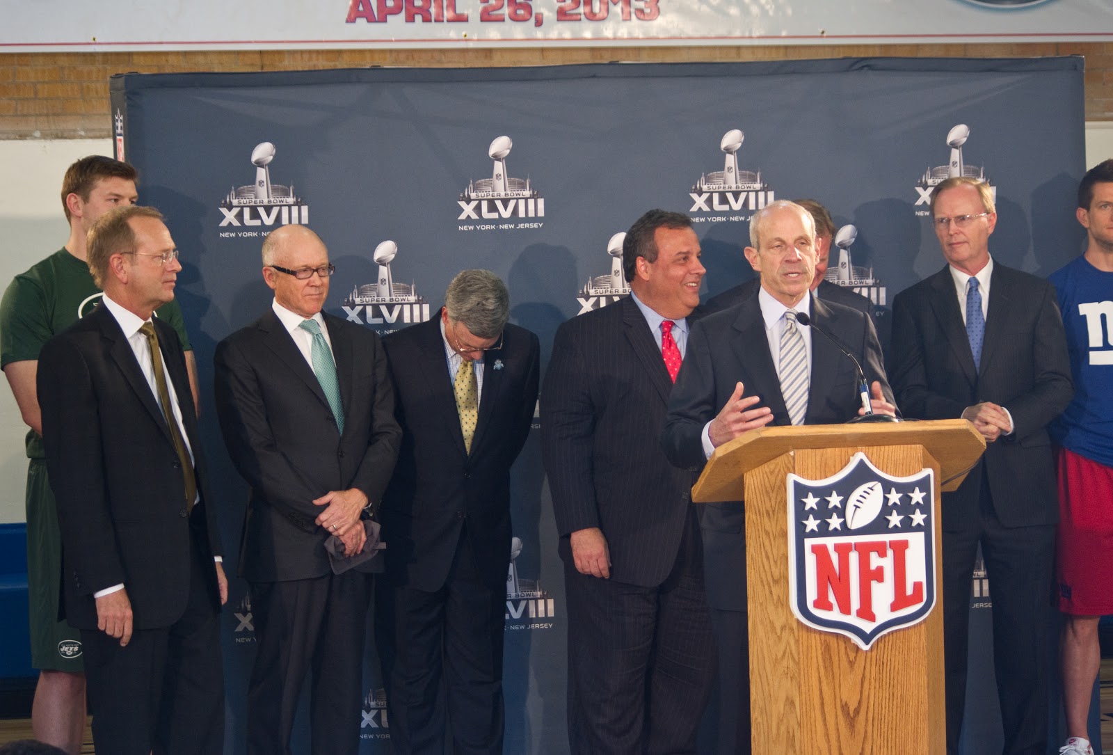 The Governor was introduced by NFL Commissioner Roger Goodell who stood near the program and Super Bow XLVII logo on the rebuilt floor of the gym saying the effort was focused “on those areas that were damaged by Hurricane Sandy.”