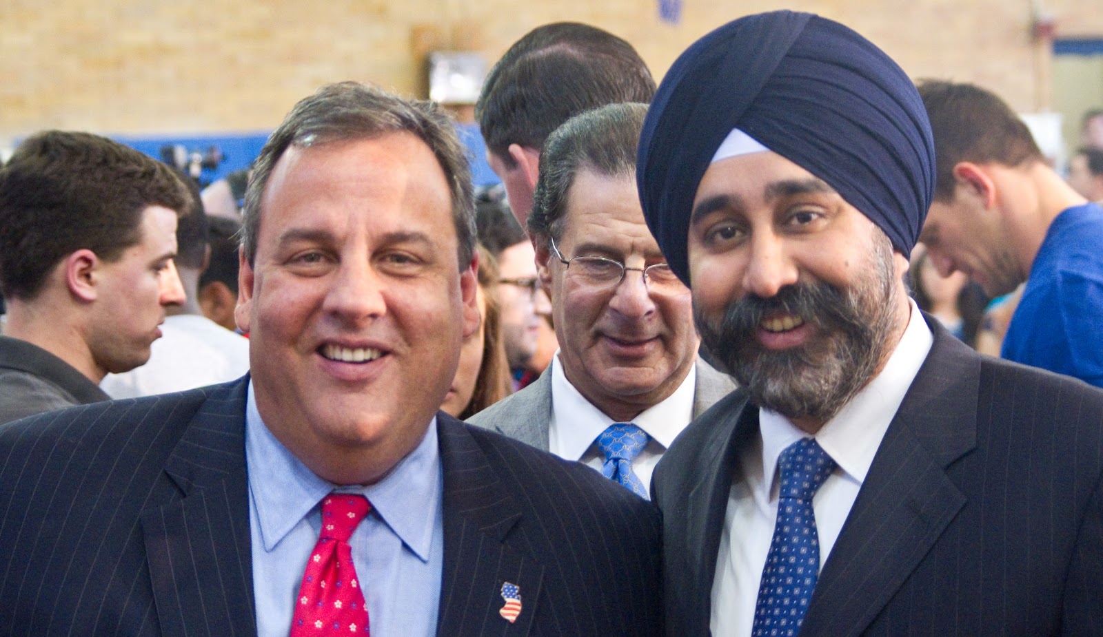| Gov. Chris Christie cheerily called out after the announcement to Hoboken Councilman Ravi Bhalla who is running for NJ State Assembly in the 33rd District. Executive Director Gary Greenberg is seen rear with NY Giant punter Steve Weatherford who appeared among NFL Giant and Jet players. |