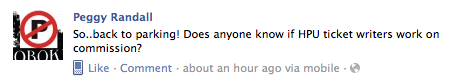 On a serious note, Peggy Randall, the Little Grocer doesn’t like parking tickets. Who does?