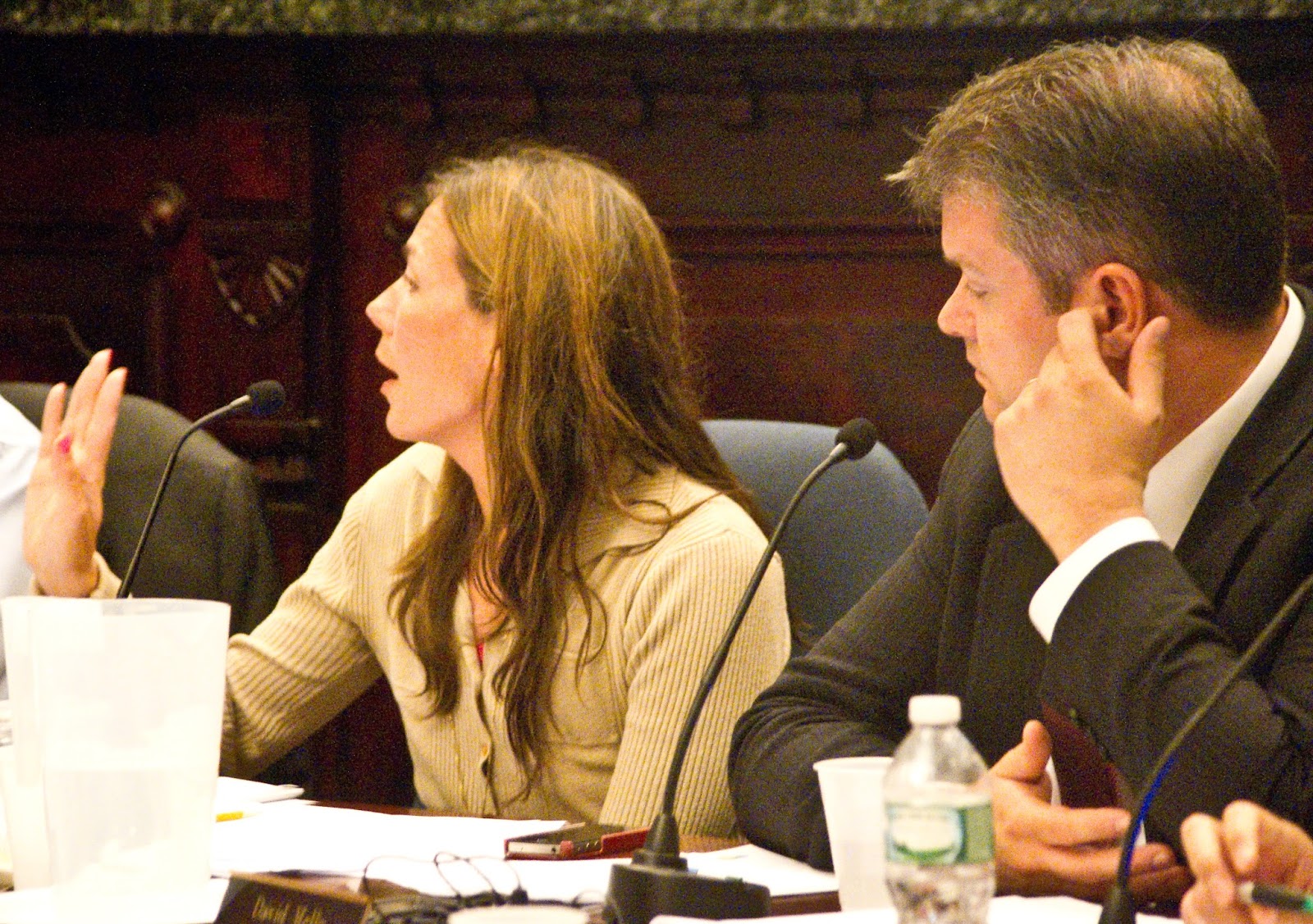 | Councilwoman Jen Giattino who heads the Finance committee interjects to correct Councilman Michael Russo on the budget amendment last night in the City Council. She countered Russo’s inaccurate information on the reductions. |