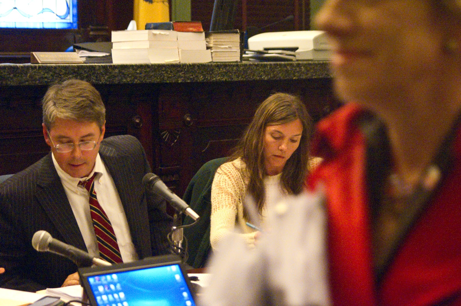 | Council President Peter Cunningham and Councilwoman Jen Giattino studiously prepare as the City Council meeting is about to start last Wednesday. Beth Mason is seen walking into the frame of the picture arriving from out front of City Hall where a truck depicting a Nazi swastika truck blared attacks on both council members among other members of reform including the current Kids First BoE trustees and the mayor. Mason appears neither sick or upset by what she just saw outside. |