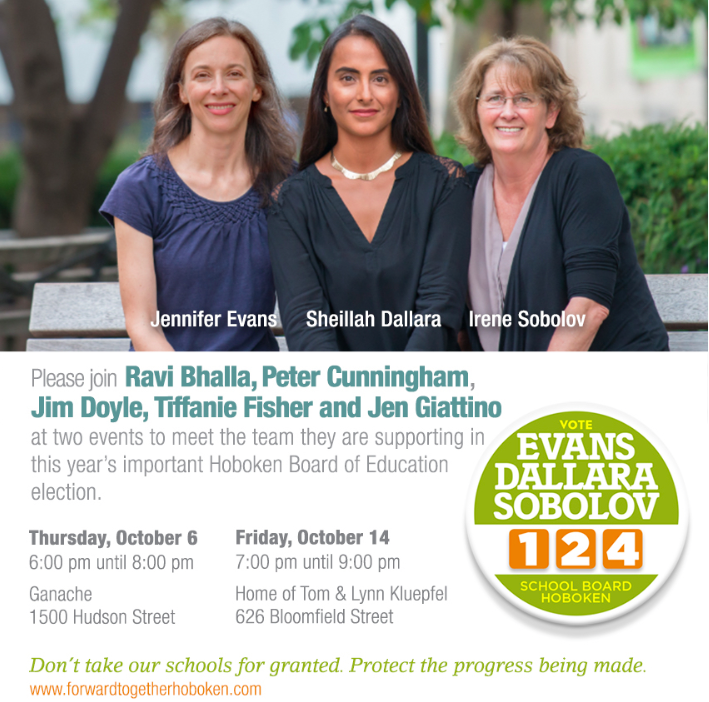 I am supporting the “Forward Together” candidates for Hoboken School Board because they are a smart well informed team comprised of two incumbents Jennifer Evans and Irene Sobolov, and newcomer Sheillah Dallara. She’s not really a newcomer. Sheillah ran a great campaign last year and did a terrific job at the candidate forum.