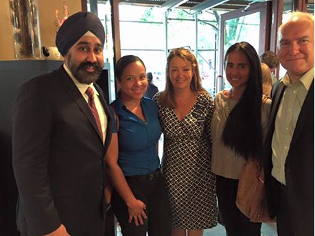 | Hoboken Council President Ravi Bhalla expressed his support for Tiffanie Fisher’s City Council run and appears with BoE trustee Tom Kelupfel and Tiffanie Fisher who is surrounded by Kleupfel’s running mates on the BoE, Addys Velez (l) and Sheillah Dallara. |