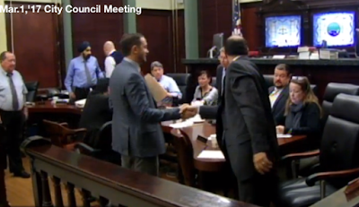 | Team DeFusco has a moment at the conclusion of the council meeting last night as council members Mike DeFusco and Ruben Ramos share a handshake. |