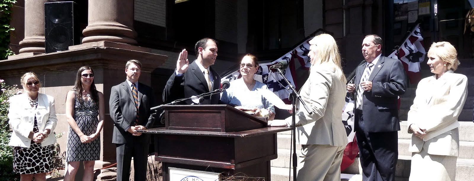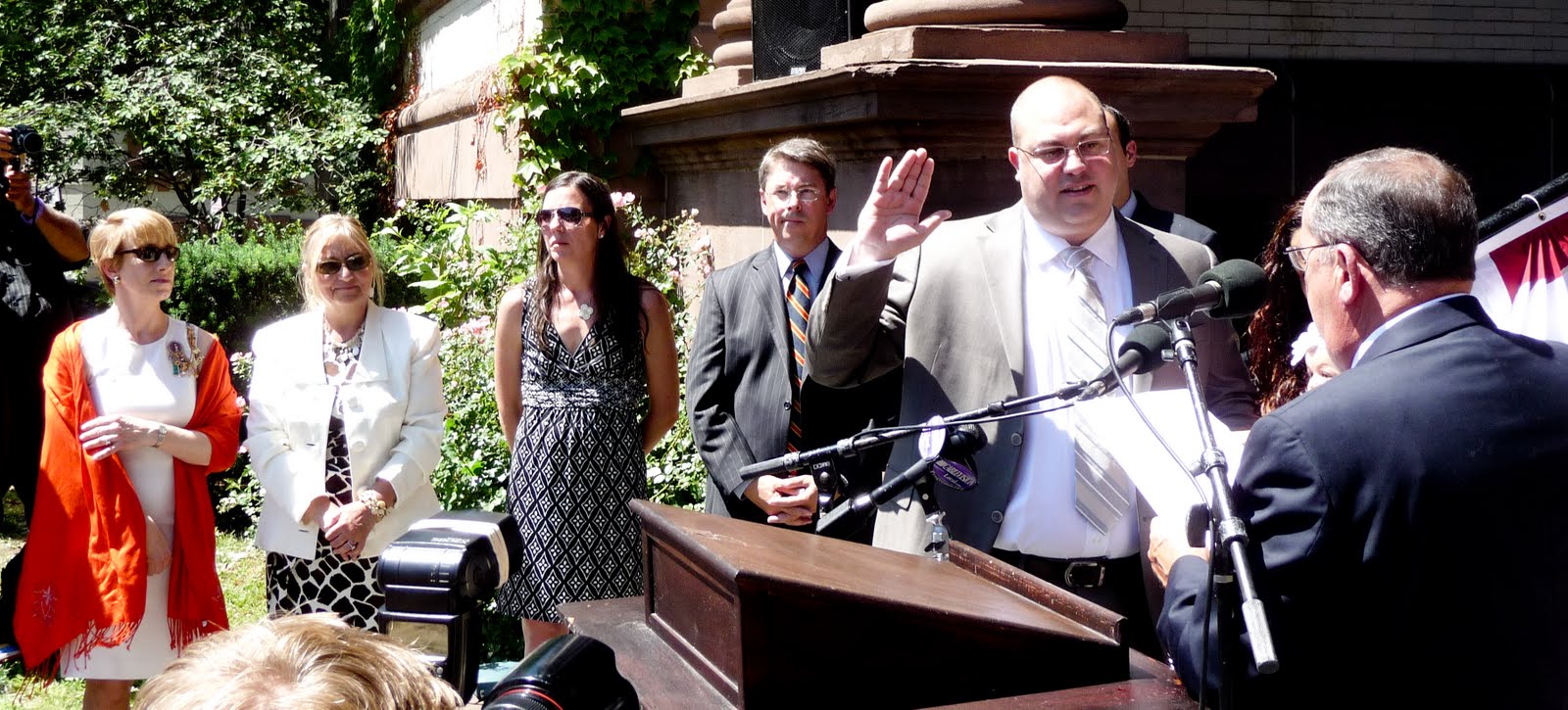 | 4th ward Councilman Tim Occhipinti is sworn in by former Hoboken Municipal Judge Kimberly Glatt |