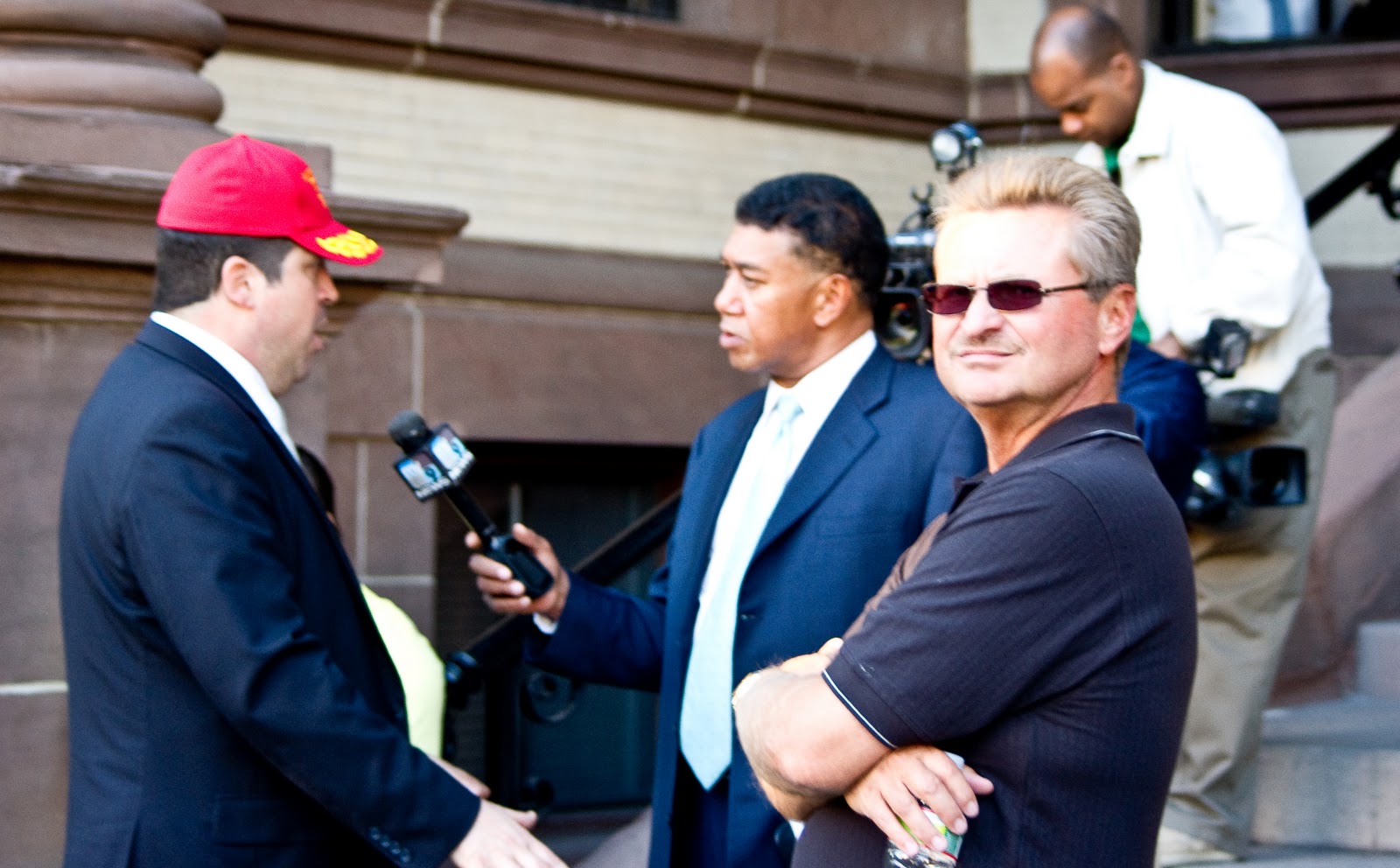| Hoboken PBA President interviews with Channel 9 as master of ceremonies Paul Swibinski stands by. Paul Swibinski of Vision Media is contracted by both the PBA and Councilwoman Beth Mason. |