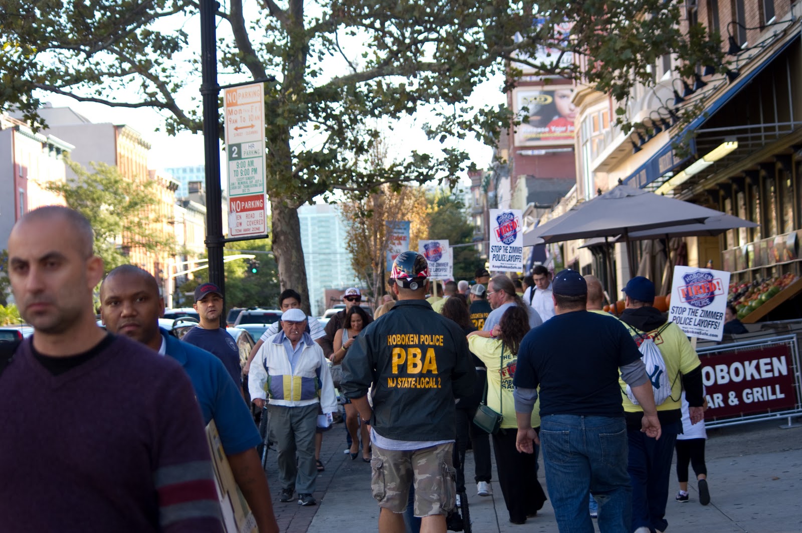 | A tale of two cities: a group of protestors walks south on Washington St. while residents head north. There was no interaction between the protestors and the public witnessed by MSV. Councilwoman Terry Castellano would most likely describe that indifference as “hatred” for Hoboken born residents. The true difference: a group largely of civil service and non-taxpaying residents and the other: those paying the freight. |