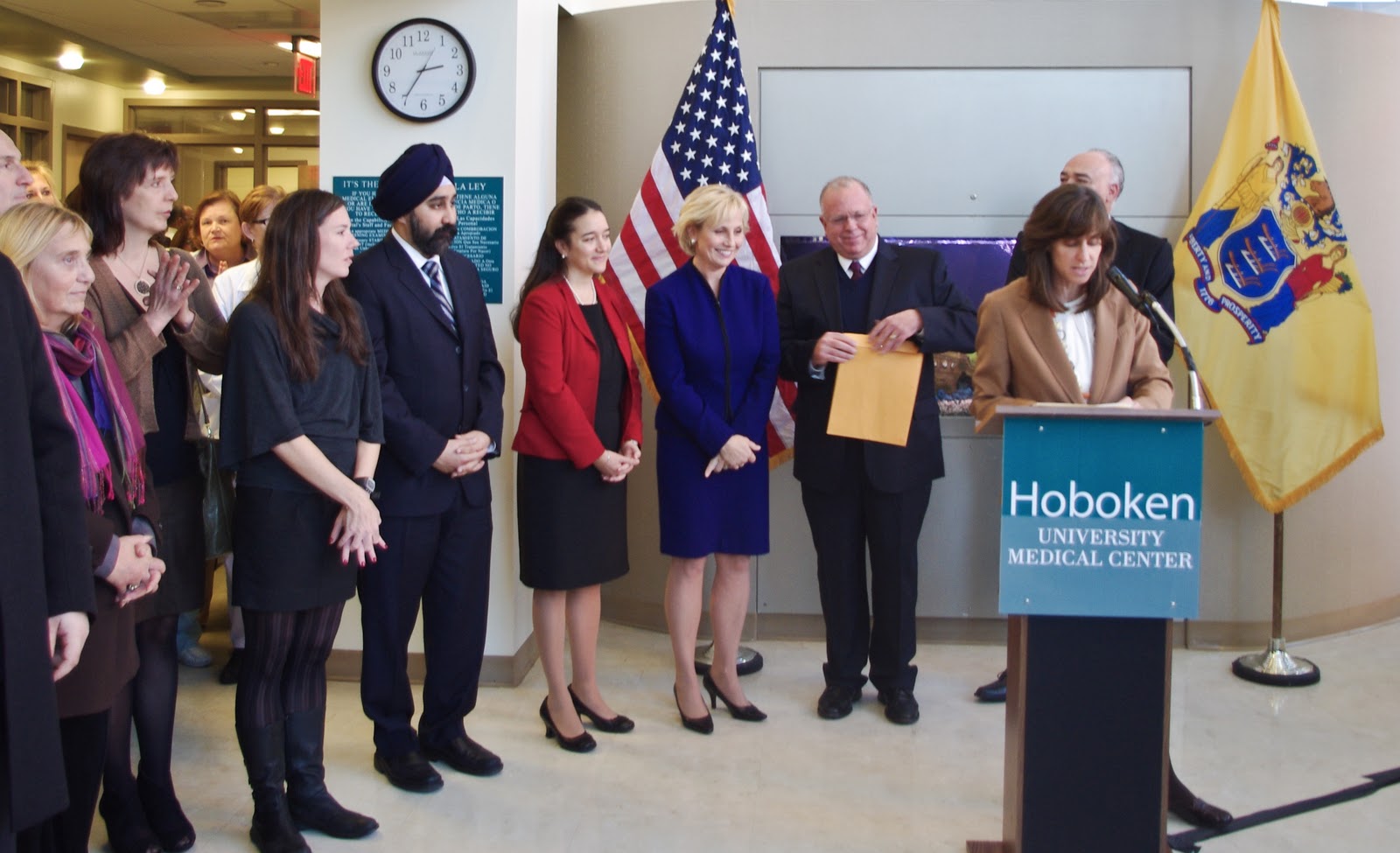 | Eyes left? One of Councilwoman Terry Castellano’s happier moments but never looking at the mayor. In one council meeting, she had remarked, “The mayor hates Hoboken.” MORTe did everything to sabotage the sale saving the hospital. Add this Hoboken success as another reason for them to hate the mayor. MORTe took no responsibility for their attempts to derail the sale and in the end claimed they saved it. |
