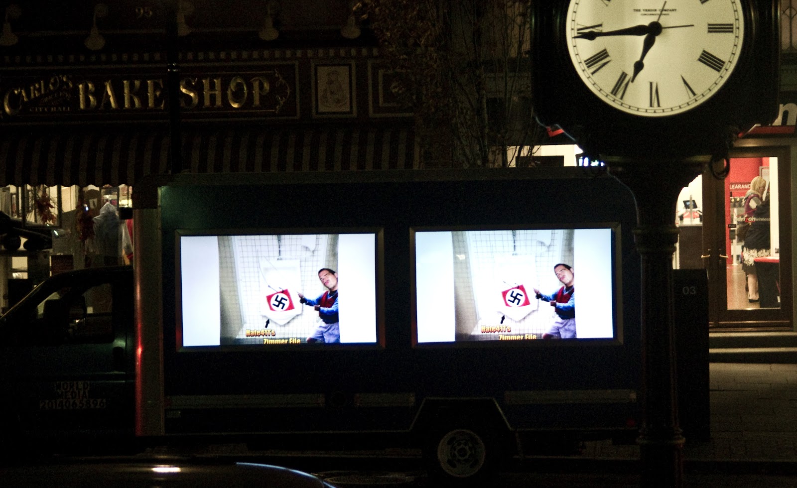 Outside the City Council at City Hall and right across the street by Carlo’s Bakery stood the big blue truck, again blaring out its video message of hate, lies and scurrilous victim hood, courtesy of a certain councilwoman’s checkbook and her Hudson County dirty tricks political operatives.