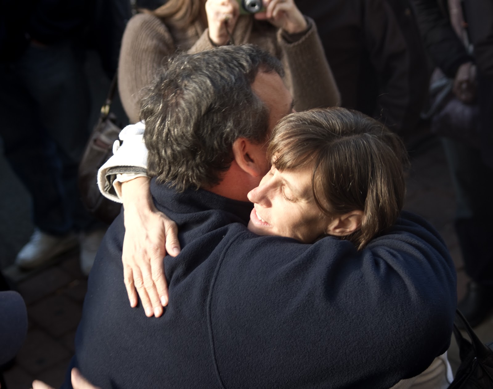| Governor Chris Christie embraces Mayor Dawn Zimmer in front of the Elks Club in Hoboken Sunday afternoon. The two have worked closely together through one of the most challenging natural disasters in NJ history |