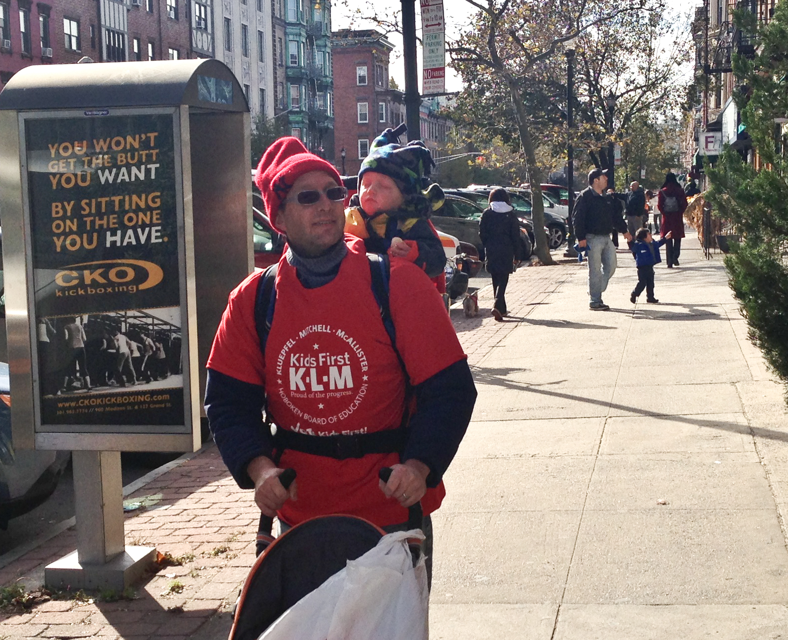 | One Hoboken Dad shows his spirit on Election Day on uptown Washington Street for Kids First. |