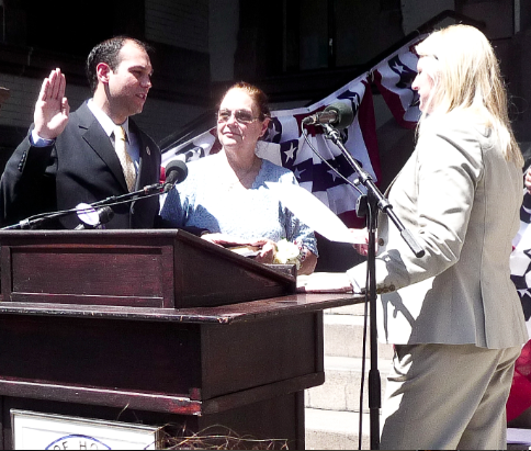 | Former municipal judge Kim Glatt swears in Tim Occhipinti in 2011. He’d like to do it again for mayor. |