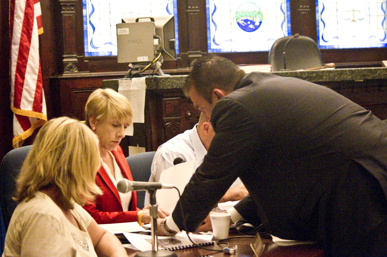| Referencing the line under discussion wasn’t working, so Director Nick Trasente went over to help Councilwoman Beth Mason understand what he was talking about on a page in the budget amendment. |