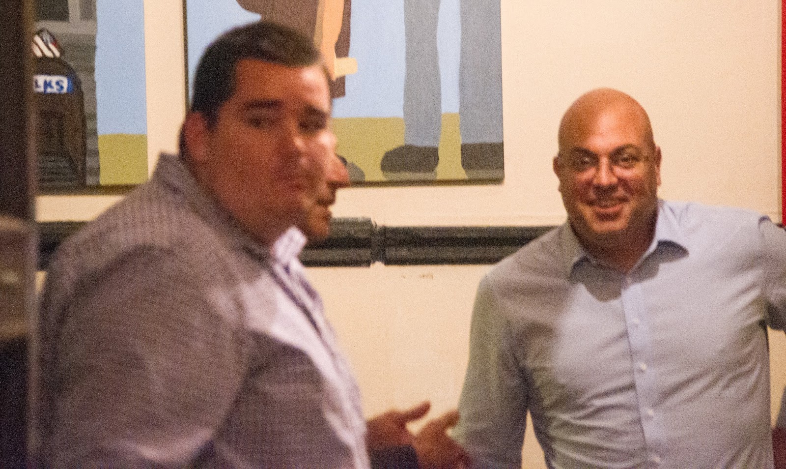 | Michael Russo offers a good humored smile with Stick Romano during the council forum near the entrance of the Elks last night as Old Guard Beth Mason lackey Matt Calicchio attempts to block a photo. In a huddle with Carmelo Garcia, who blew off half the forum to attend a fundraiser; Romano offered some final words before Garcia left, who arrived late and leaving early; his signature role in government positions which he contrasted with his voicings he’ll be available 24-7 to Hoboken residents. |