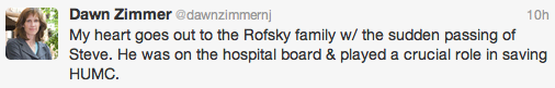 Steve Rofsky a member of the Hoboken Municipal Hospital Authority passed away suddenly earlier today with what was believed to be an aneurysm. Rofsky was a critical part of the leadership appointed to the hospital board who took decisive action and in the end saved both the hospital and Hoboken from bankruptcy. Steve is survived by his wife Toby and sons Phillip and Marc. He was 55.