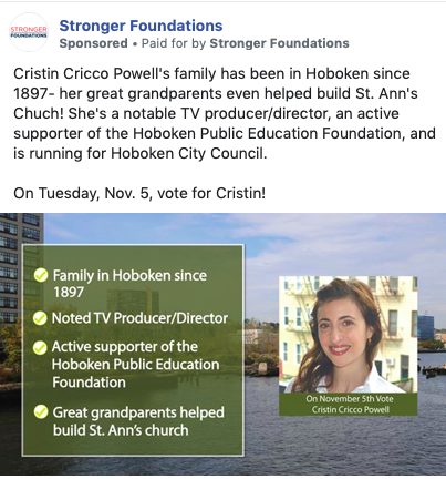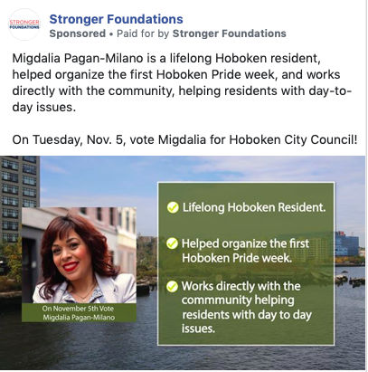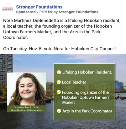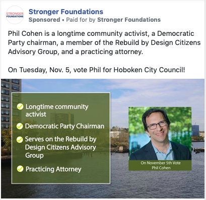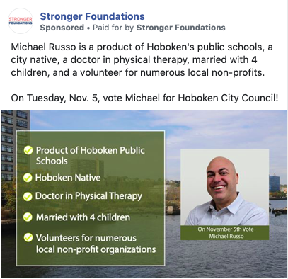 The ad campaign on Facebook began for each on October 29th and is likely to continue into the Hoboken council elections on Tuesday: