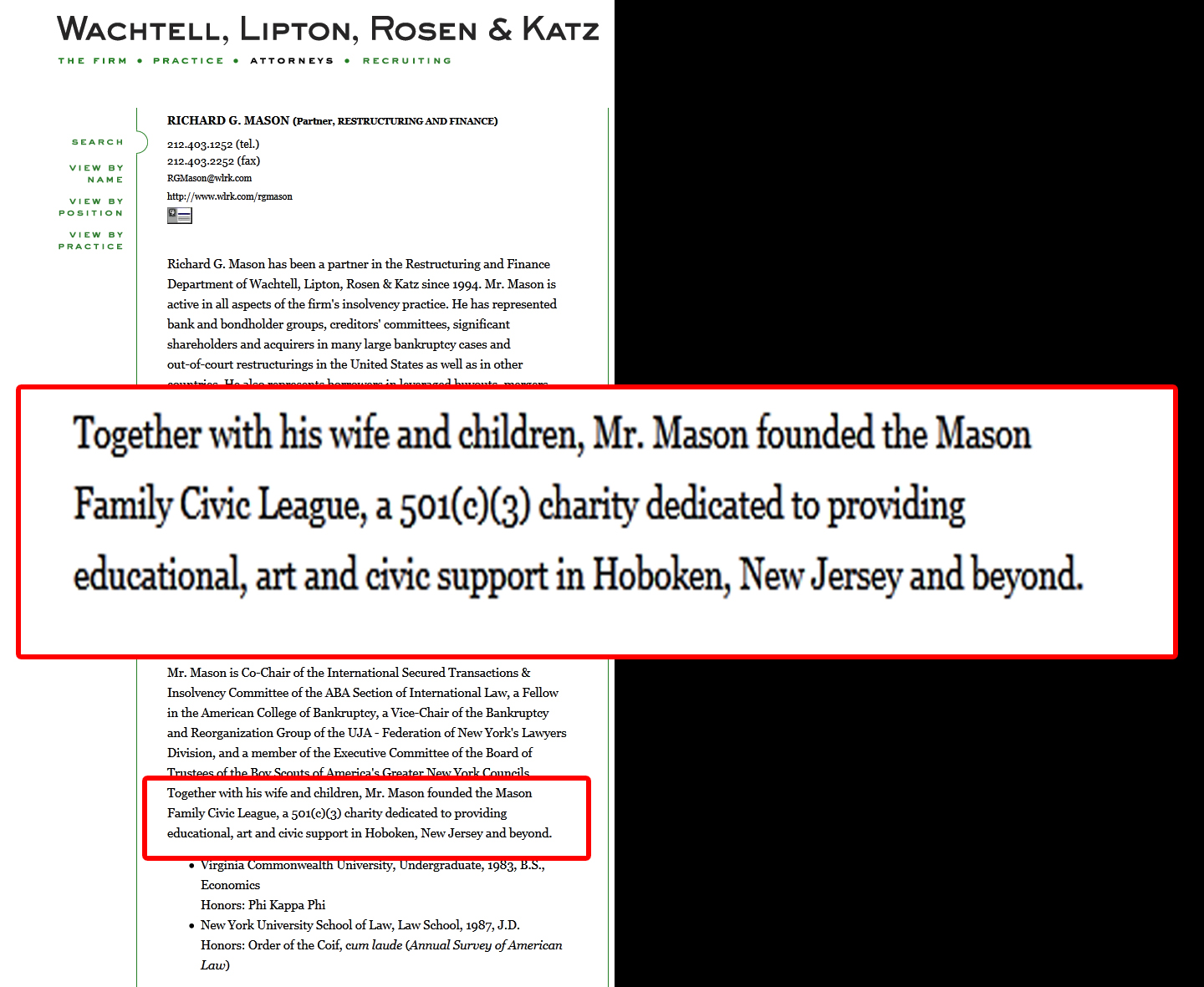 | Ricky Mason describes a Mason Family Civic League, a different name but one also claiming to do civic support. This excerpt appears on the Wachtell, Lipton, Rosen and Katz website. |
