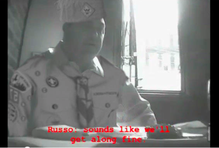 | Councilman Michael Russo as seen in 2009 FBI surveillance video agreeing to accept bribes, cub scout gear courtesy Grafix Avenger. |
