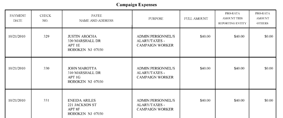 MSV has taken an initial look at the report and notes several interesting aspects. There’s already over dozens* “campaign workers” appearing in the usual area of the Hoboken Housing Authority – all with that familiar signature payment of $40.
