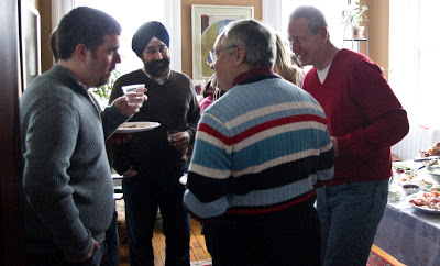 | Tom Greaney (r) enjoys a hearty laugh with a group including Councilman Ravi Bhalla |